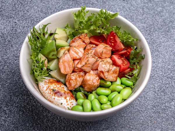 Лосось фарерский, рис, авокадо, огурец, шпинат, имбирь, соус понзу, соус ореховый, бобы эдомаме, фенхель, сыр сливочный, перец болгарский, кунжут, нори